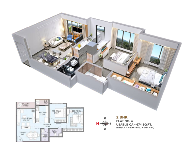 The Midtown presents a range of meticulously planned 2BHK and 3BHK apartments, catering to diverse lifestyle needs. The 2BHK units feature a RERA carpet area of 620 square feet, with a total usable area of approximately 674 square feet, including balconies and dry balconies. The L-shaped layouts are designed to maximize natural light and ventilation, offering:
