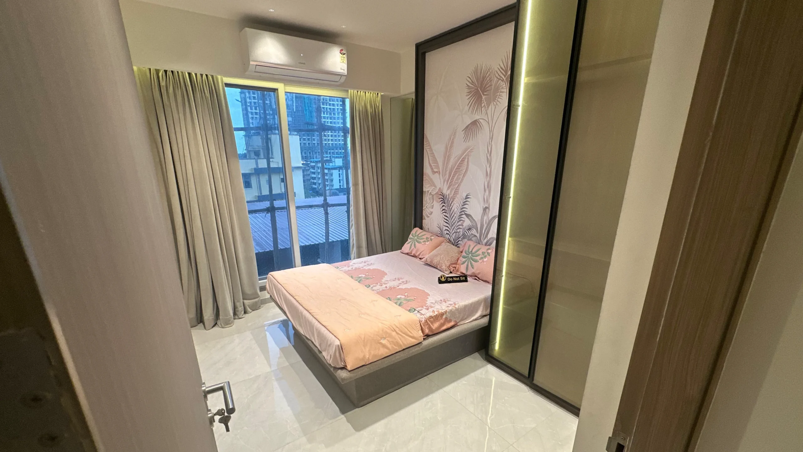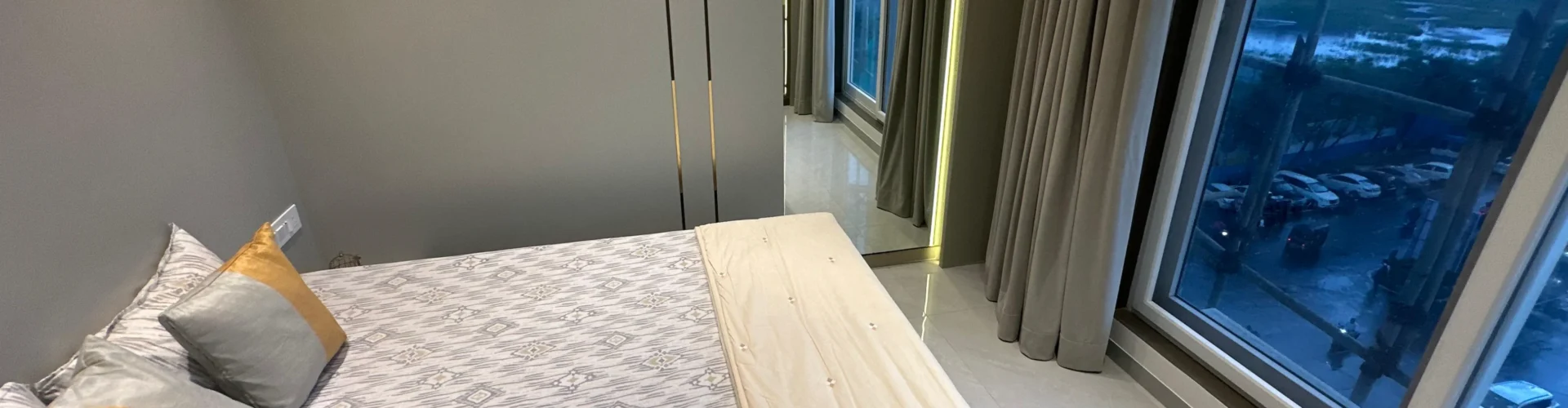 - Bedrooms: Two well-appointed rooms (primary approx. 10×12 ft, secondary 10×10 ft) with laminated wooden flush doors, built-in wardrobes, and electrical points for AC, fans, lights, and TVs.