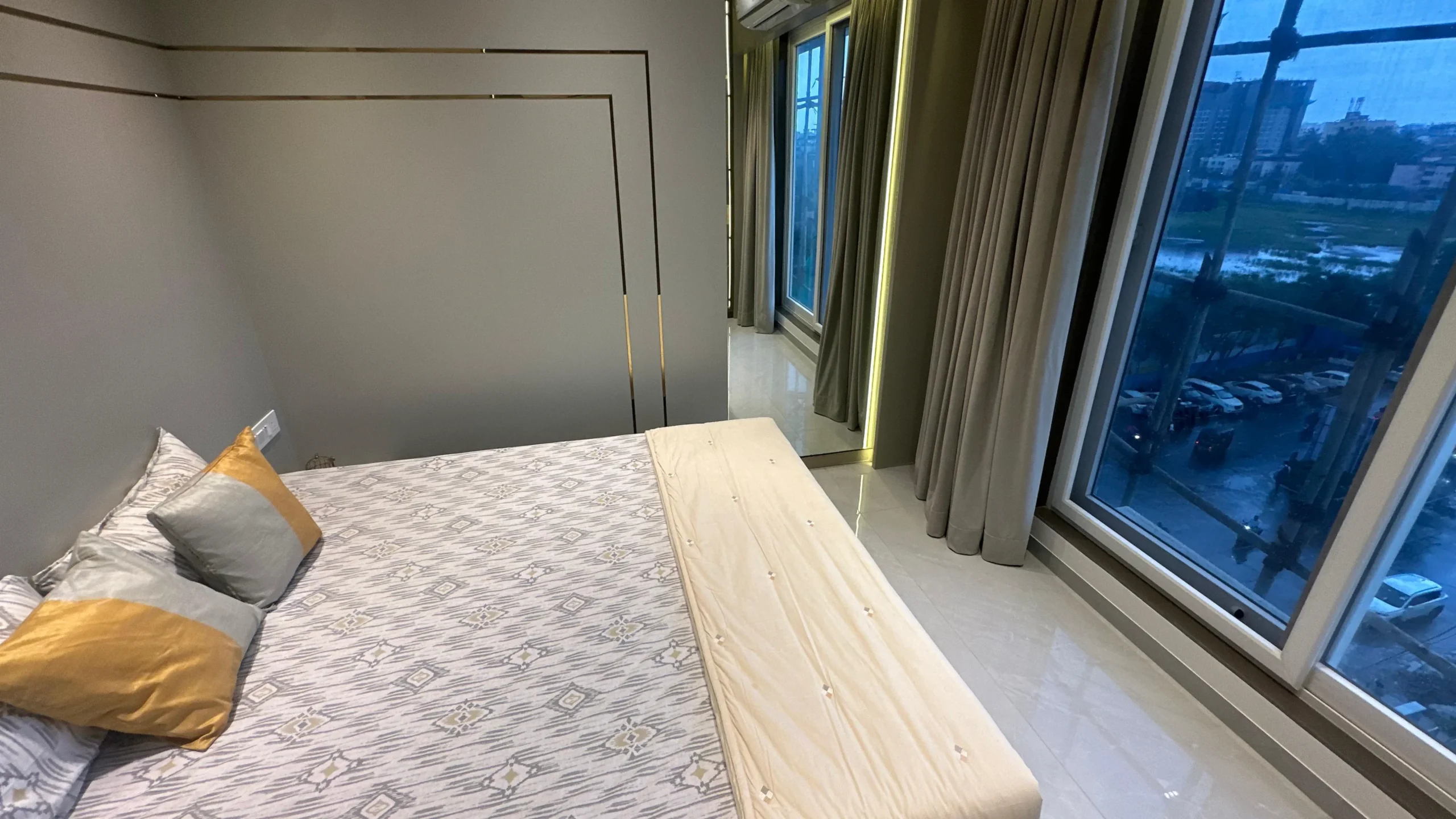 - Living and Dining Area: A spacious open-plan design (approx. 12×15 ft) with vitrified flooring, false ceiling, and MS-railed windows for stunning views.