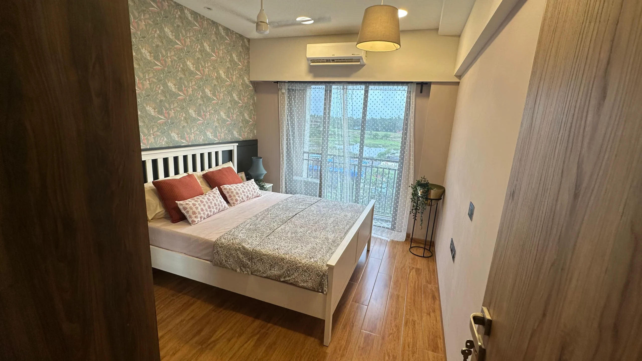 - Doors and Windows: Wooden main door with teak finish, anodized aluminum sliding windows.