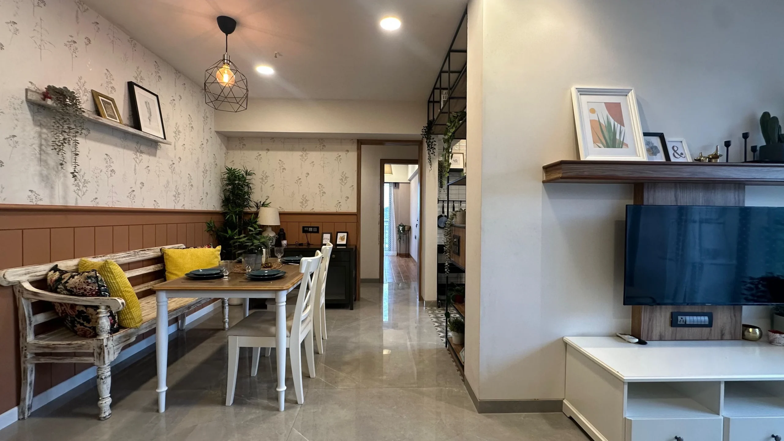 - Living and Dining Area: Spacious open-plan with vitrified tiles flooring and gypsum/lustre paint finishes.